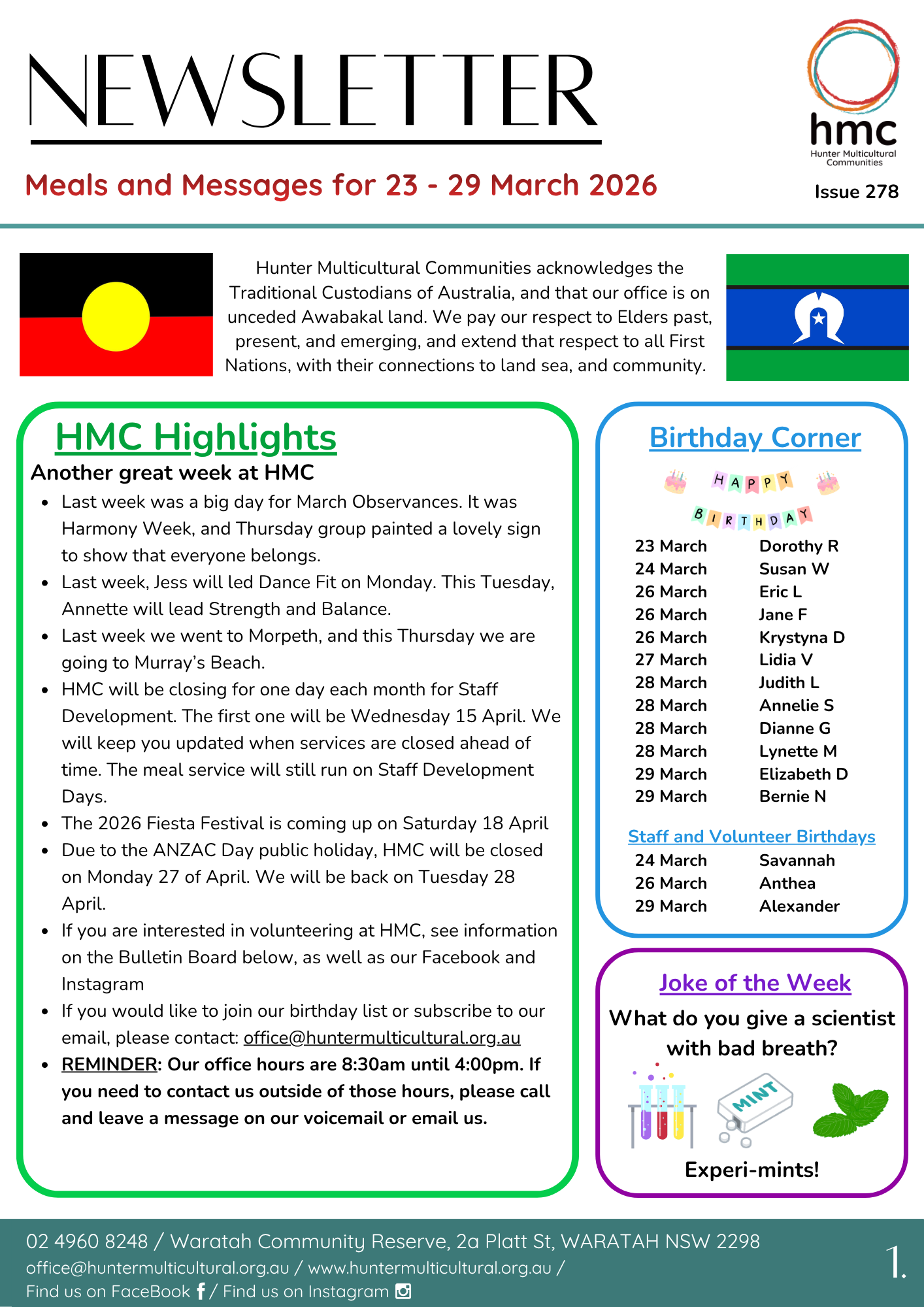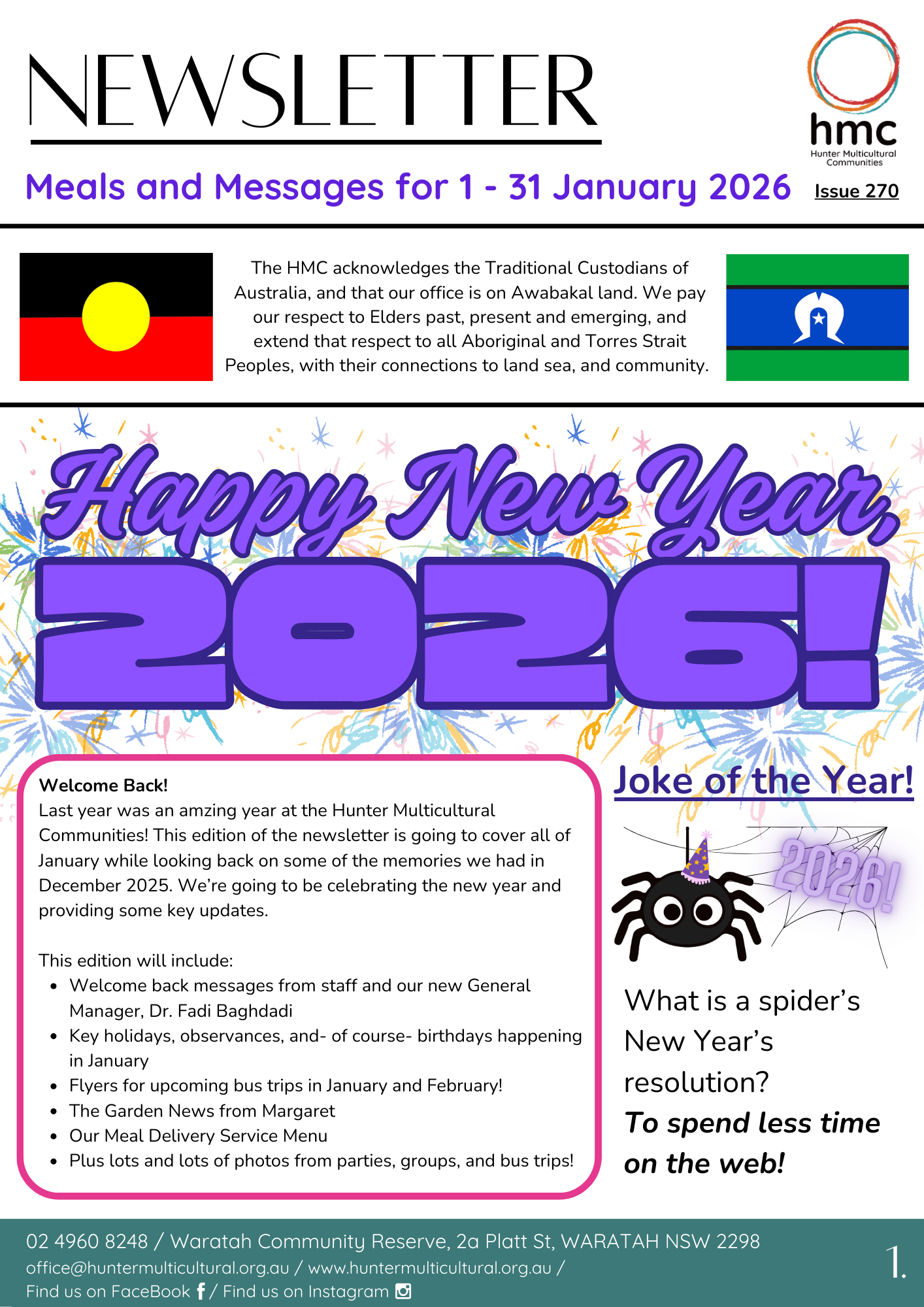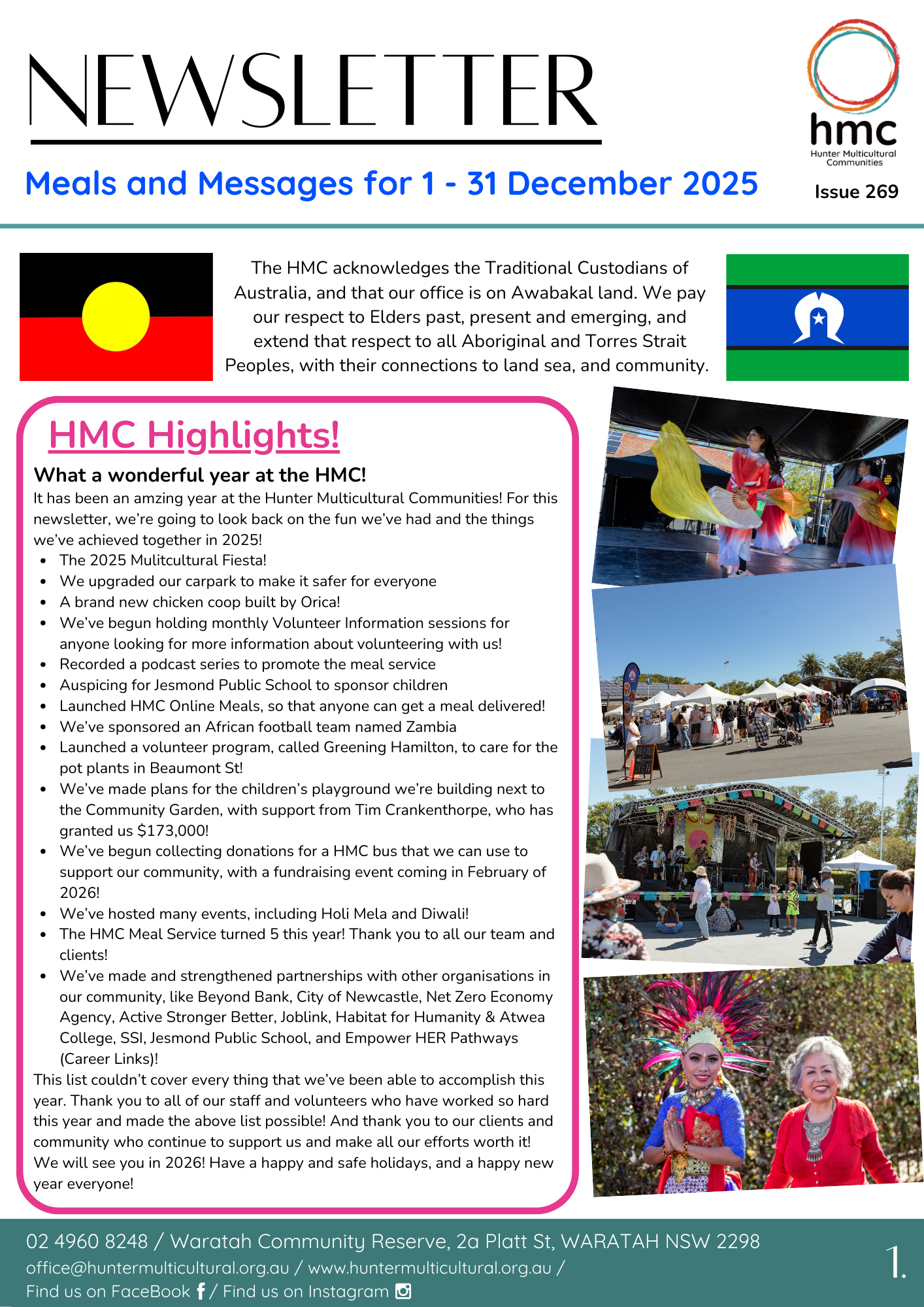 Hunter Multicultural Communities publishes a weekly newsletter with information about our seniors social group events and excursions, our monthly menus for our meal delivery services and other community news.
